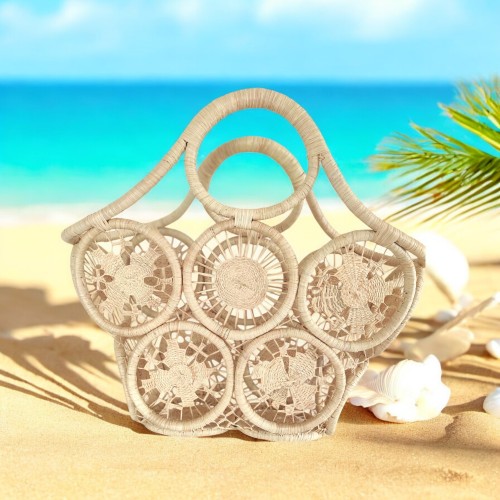 Το σχέδιο της τσάντας είναι μια πραγματική έμπνευση. Πλεκτοί κύκλοι από ψάθα, με περίτεχνες λεπτομέρειες, δημιουργούν μια τρισδιάστατη υφή που μαγνητίζει το βλέμμα. Η τεχνική πλέξης μακραμέ, συνδυάζει άψογα το boho και ethnic στυλ με μια σύγχρονη και κομψή αισθητική. Το φυσικό χρώμα της ψάθας προσθέτει μια νότα γήινης κομψότητας, καθιστώντας την τσάντα ιδανική για κάθε περίσταση. Διαστάσεις: Βάση:14x30cm Άνοιγμα:48cm Υψος:30cm