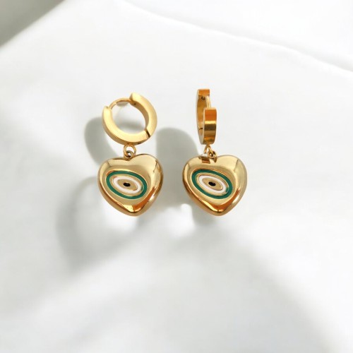 Ατσάλινα Σκουλαρίκια κρίκοι με κρεμαστή καρδιά και μάτι πράσινο σμάλτο με υποαλλεργικό κούμπωμα. Έχουν μέγεθος 17mm. Αποτελούν μια χαριτωμένη και εντυπωσιακή επιλογή κοσμήματων που συνδιάζει το ρομαντικό σύμβολο της καρδιάς με το ζωηρό πράσινο χρώμα του σμάλτου.