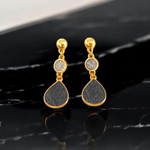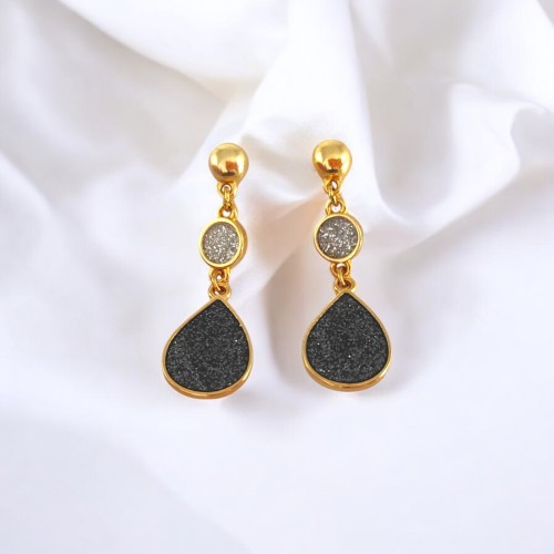 Σκουλαρίκια σύνθεση σταγόνα με ανθρακί glitter και μικρό κύκλο με ασημί glitter από επίχρυσο ζάμακ. Έχουν υποαλλεργικό κούμπωμα από καρφάκι τιτανίου. Τα στοιχεία συνδέονται μεταξύ τους με μικρούς κρίκους, επιτρέποντας την ελεύθερη κίνηση και την ανάδειξη της λάμψης του glitter. Ιδανικά για όλες τις εμφανίσεις.