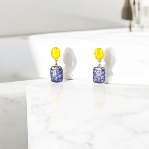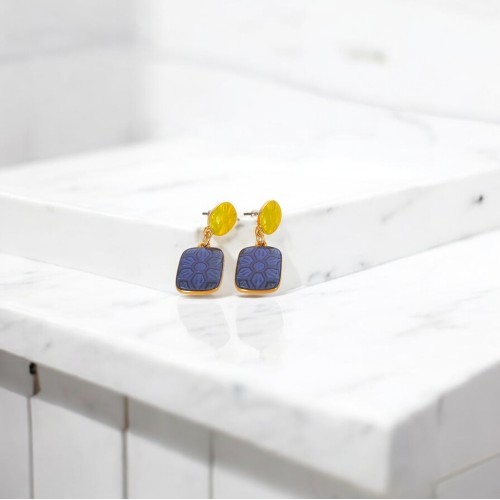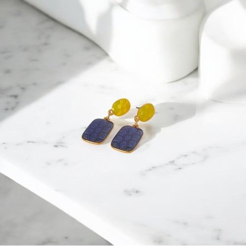 Αυτά τα μοναδικά σκουλαρίκια "Ηλιοβασίλεμα σε Βασιλικό Μπλε" συνδυάζουν την κομψότητα με μια vintage αισθητική. Το βαθύ μπλε τετράγωνο σχήμα με το λεπτομερές μοτίβο λουλουδιών, θυμίζει πορσελάνη, ενώ το λαμπερό κίτρινο στρογγυλό στοιχείο στην κορυφή, προσθέτει μια φωτεινή πινελιά. Ο συνδυασμός του βαθύ μπλε με την κίτρινη λάμψη δημιουργεί ένα εντυπωσιακό αποτέλεσμα που θα τραβήξει τα βλέμματα.