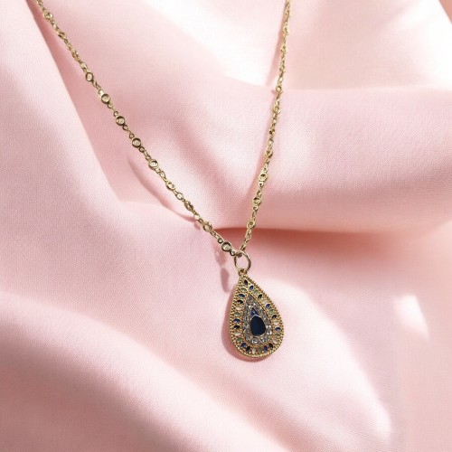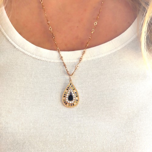 Κολιέ με ατσάλινη αλυσίδα και μενταγιόν σε σχήμα δάκρυ με πολύχρωμες πέτρες.Έχει μήκος 62 cm. Αυτό το εντυπωσιακό κολιέ θα προσθέσει μια πινελιά λάμψης και κομψότητας σε κάθε εμφάνιση. Το μενταγιόν σε σχήμα δάκρυ αποτελεί το κεντρικό στοιχείο του κοσμήματος, τραβώντας τα βλέμματα με τον ιδιαίτερο σχεδιασμό του.