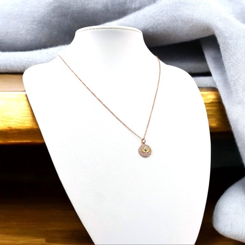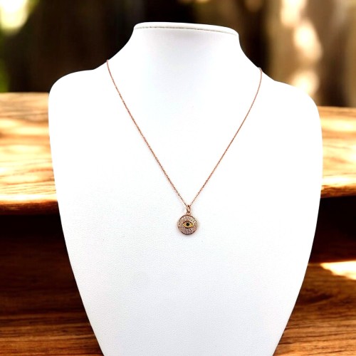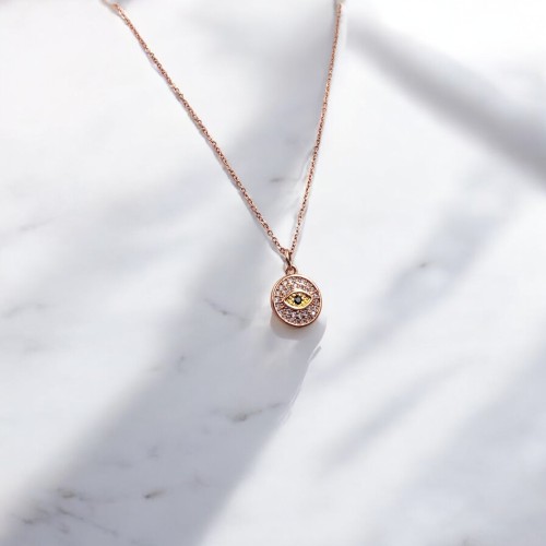 Κολιέ με ατσάλινη ροζ αλυσίδα και στρογγυλό μενταγιόν με μάτι. Έχει μήκος 50cm. Είναι διακοσμημένο με λευκά κρύσταλλα και μαύρη πέτρα, που αιχμαλωτίζουν το φως και προσδίδουν μια διακριτική πολυτέλεια, θετικής ενέργειας. Έχει ιδανικό μήκος για να φοριέται μόνο του ή σε συνδυασμό με άλλα κολιέ.