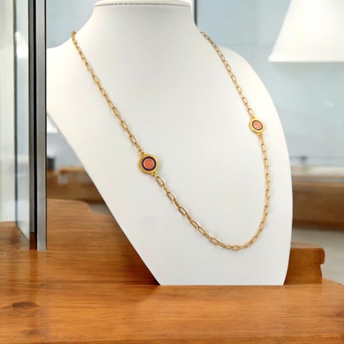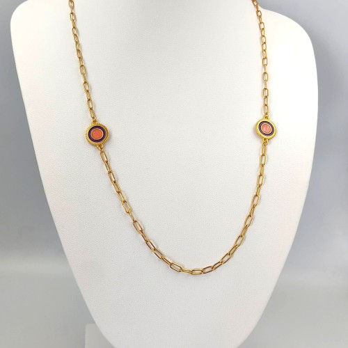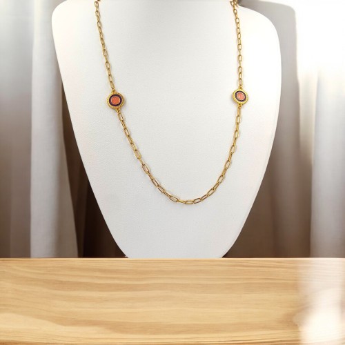 Κολιέ με ατσάλινη αλυσίδα και Οβάλ Στοιχεία απο επίχρυσο ζάμακ με Κοραλλί και Μώβ σμάλτο.Έχει μήκος 60cm. Το κολιέ έχει μια vintage, ρετρό αισθητική, ίσως με επιρροές από τα '70s. Ο συνδυασμός του χρυσού με το πορτοκαλί/κοραλλί και το μώβ δημιουργεί μια ενδιαφέρουσα χρωματική αντίθεση. Το χοντρό σχέδιο της αλυσίδας προσδίδει μια πιο statement εμφάνιση.