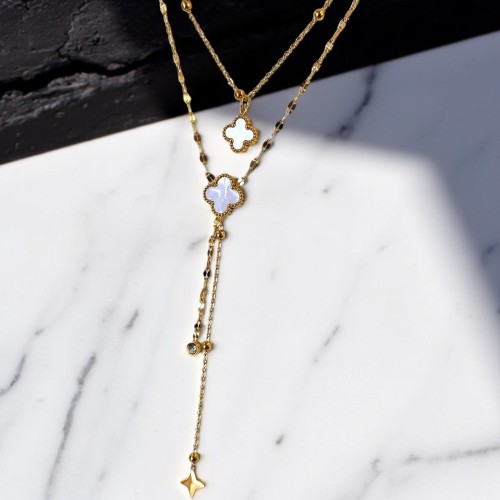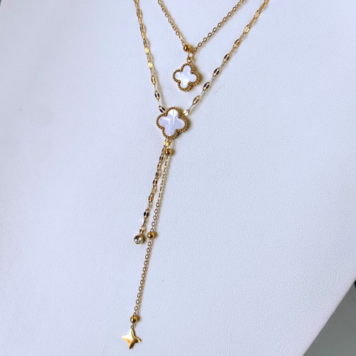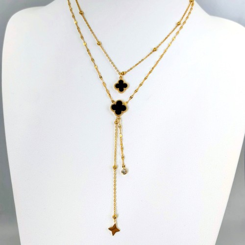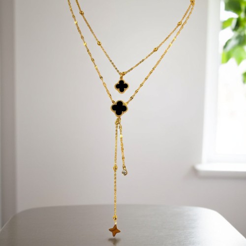 Κολιέ με ατσάλινη διπλή αλυσίδα και μοτίφ διπλής όψης σε άσπρο και μαύρο φίλντισι.Έχει μήκος 45cm + 5cm extension. Το σχέδιο χαρακτηρίζεται από το μοτίβο του τετράφυλλου τριφυλλιού, το οποίο συμβολίζει την τύχη, την υγεία, την αγάπη και τον πλούτο.Το κολιέ έχει ιδανικό μήκος για να φοριέται μόνο του ή σε συνδυασμό με άλλα κοσμήματα.
