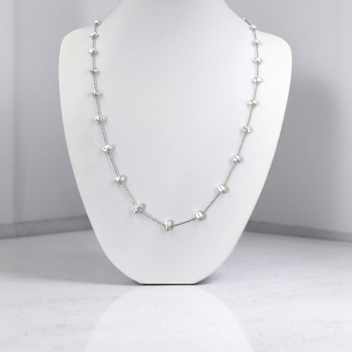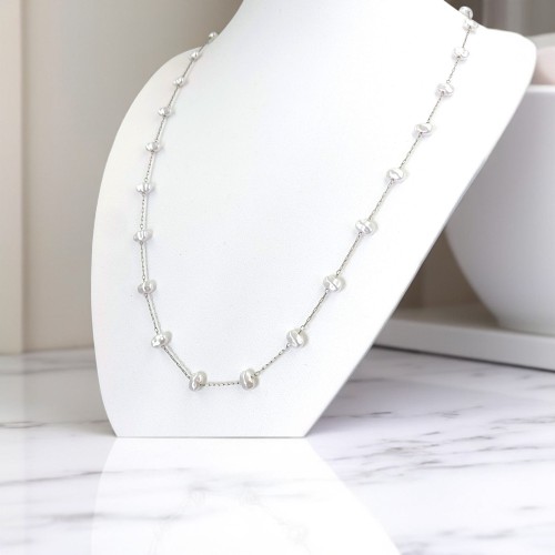 Κολιέ με ατσάλινη αλυσίδα και πέρλες σε ασημί. Έχει μήκος 63cm. Συνδυάζοντας τις κλασικές πέρλες με την μοντέρνα αλυσίδα, αυτό το κόσμημα προσφέρει μια εκλεπτυσμένη αισθητική που ταιριάζει σε κάθε περίσταση.
