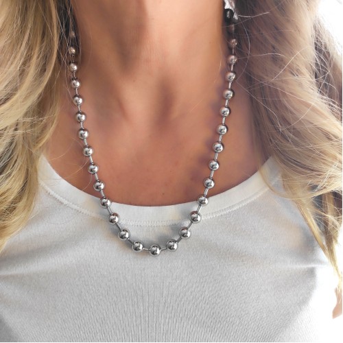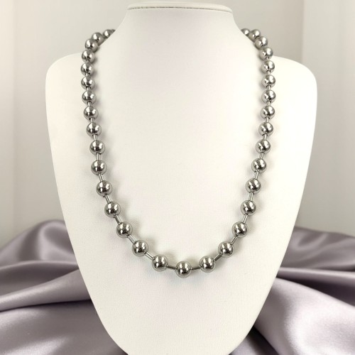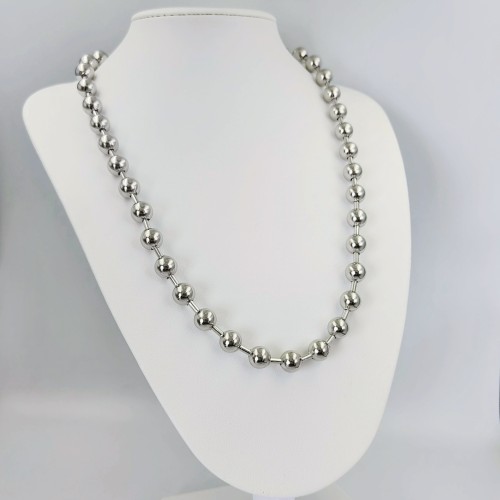 Κολιέ ατσάλινο με μεγάλες μπίλιες σε ασημί. Έχει μήκος 60cm. Αυτό το κομψό κολιέ με τις στρογγυλές ασημένιες μπίλιες, συνδυάζει μια μοντέρνα και λαμπερή εμφάνιση. Το σχέδιο είναι κλασικό και ευέλικτο, ταιριάζοντας με κάθε στυλ.
