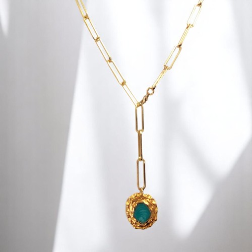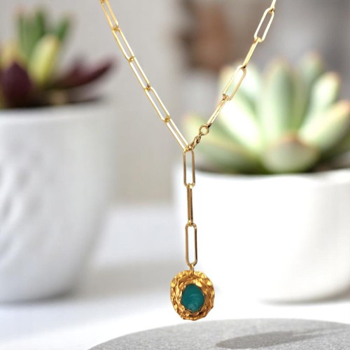 Κολιέ αλυσίδα από ορείχαλκο με μεγάλους κρίκους και μοτίφ με γαλάζια πέτρα. Έχει μήκος 70cm. Το εντυπωσιακό κολιέ συνδυάζει την industrial αισθητική με μια boho πινελιά. Διαθέτει μια αλυσίδα από ορείχαλκο με μεγάλους κρίκους, που προσδίδει μια μοντέρνα και δυναμική εμφάνιση. Στο κολιέ κρέμεται ένα μοτίφ με μια γαλάζια πέτρα, που προσθέτει χρώμα και λάμψη.