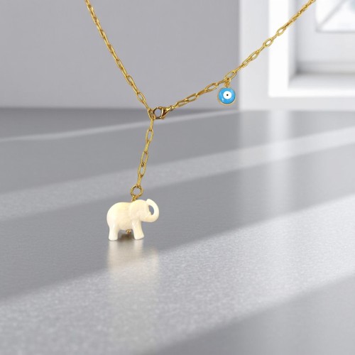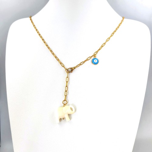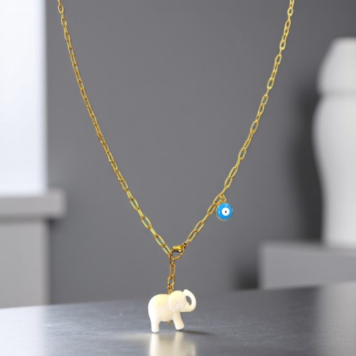 Κολιέ από ατσάλινη αλυσίδα με κρίκους και μοτίφ ελέφαντα και ματάκι σε χρυσό. Έχει μήκος 90 cm. Το εντυπωσιακό κολιέ διαθέτει μια χρυσή ατσάλινη αλυσίδα με μεγάλους κρίκους, που προσδίδει μια μοντέρνα και δυναμική εμφάνιση. Στο κολιέ κρέμονται δύο μοτίφ: ένας ελέφαντας, σύμβολο δύναμης και σοφίας, και ένα μάτι, σύμβολο προστασίας και καλής τύχης. Το μήκος του το καθιστά ιδανικό για να φορεθεί μόνο του ή να συνδυαστεί με άλλα κολιέ για ένα layered look.