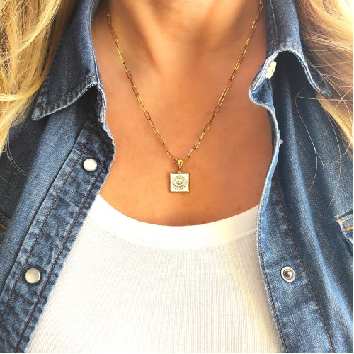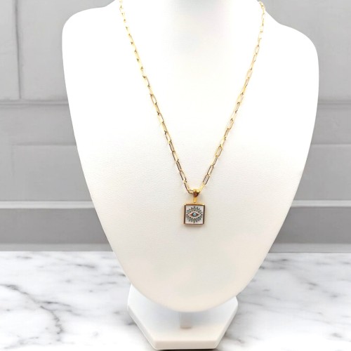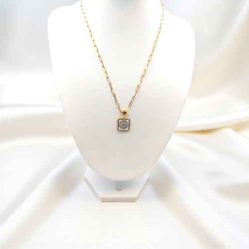 Κολιέ από ατσάλινη αλυσίδα με μοτίφ μάτι. Έχει μήκος 50cm.Το κολιέ είναι διακοσμημένο με ένα τετράγωνο μοτίφ ματιού, που προσθέτει μια αίσθηση μυστηρίου και κομψότητας.