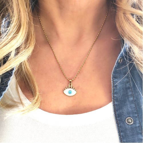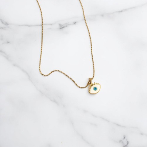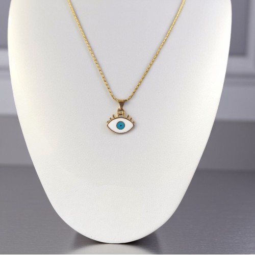 Το ατσάλινο κολιέ με μάτι διαθέτει επίχρυση αλυσίδα και μενταγιόν με λεπτομέρειες από λευκό και γαλάζιο σμάλτο, αποτυπώνοντας το κλασικό «μάτι» με μοντέρνο ύφος. Έχει μήκος 50cm + 5cm extension.