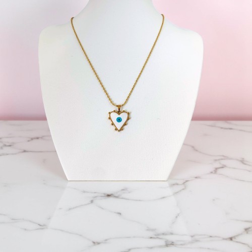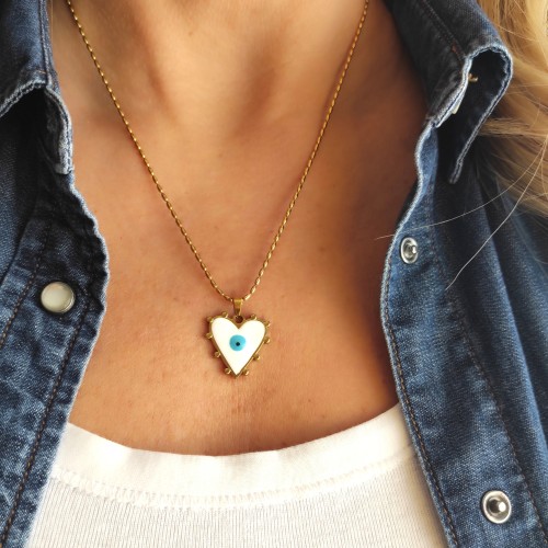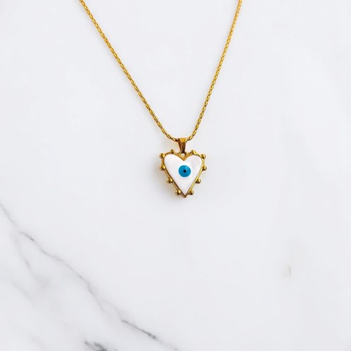 Το ατσάλινο κολιέ με μενταγιόν σε σχήμα καρδιάς, είναι διακοσμημένο με λευκό σμάλτο και ένα κεντρικό γαλάζιο ματάκι. Οι διακριτικές χρυσές λεπτομέρειες γύρω από την καρδιά χαρίζουν μοναδικότητα και φινέτσα. Φοριέται άνετα από το πρωί μέχρι το βράδυ. Έχει μήκος 50cm + 5cm extension.
