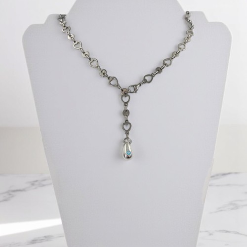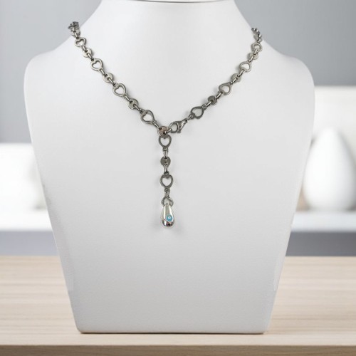 Κολιέ με ατσάλινη αλυσίδα που αποτελείται από κομψά στοιχεία σε σχήμα καρδιάς, και καταλήγουν σε μια διακριτική σταγόνα με ματάκι – σύμβολο προστασίας και καλής τύχης. Έχει μήκος 80cm. Το ιδιαίτερο σχέδιο του το καθιστά ιδανικό για στιλάτες εμφανίσεις, ενώ η λαμπερή του απόχρωση ταιριάζει με κάθε outfit. Ένα μοναδικό κόσμημα που προσθέτει φως, στυλ και νόημα στην καθημερινότητά σου.