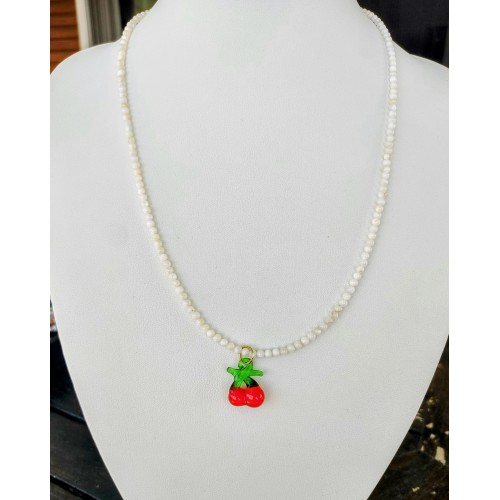 Χαρίστε μια νότα παιχνιδιάρικης κομψότητας στο στυλ σας με αυτό το αξιολάτρευτο χειροποίητο κολιέ! Μια σειρά από λαμπερές χάντρες φίλντισι, με την ιριδίζουσα λάμψη τους, αγκαλιάζει τον λαιμό, ενώ ένα χαριτωμένο κρεμαστό κερασάκι προσθέτει μια αναπάντεχη και φρέσκια πινελιά. Ιδανικό για να φωτίσετε την καθημερινότητά σας ή να προσφέρετε ένα μοναδικό δώρο που ξεχειλίζει από φρεσκάδα και χαρά.