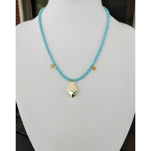 Ένα κόσμημα εμπνευσμένο από τις ομορφιές και τους μύθους της θάλασσας. Η κλασική ομορφιά των λευκών χαντρών δένει αρμονικά με το έντονο κόκκινο ενός κρεμαστού κοραλλιού και το προστατευτικό ματάκι. Χειροποίητο και μοναδικό, είναι το ιδανικό αξεσουάρ για να αναδείξετε το στυλ σας και να νιώθετε ασφαλής.