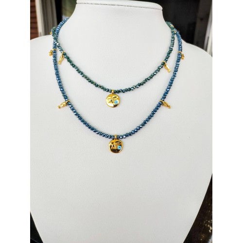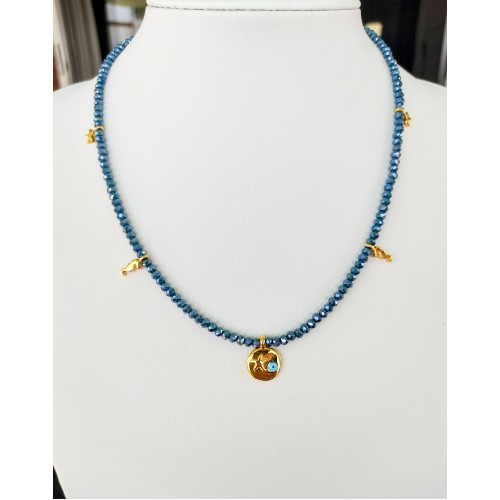 Ένα μίνιμαλ και ταυτόχρονα συμβολικό κολιέ με λαμπερές γαλάζιες χάντρες. Ο διακριτικός σχεδιασμός του το καθιστά ιδανικό για καθημερινή χρήση, προσθέτοντας μια νότα χρώματος και προστασίας σε κάθε σύνολο. Το ενσωματωμένο σχέδιο του ματιού προσδίδει διαχρονική γοητεία.