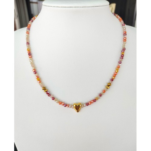 Ένα κολιέ με ιδιαίτερο νόημα και διαχρονική γοητεία. Οι χάντρες σε θερμούς τόνους δημιουργούν ένα εντυπωσιακό φόντο για την κεντρική χρυσή καρδιά, καθιστώντας το ιδανικό για όσους αναζητούν ένα κόσμημα που συνδυάζει φινέτσα με προσωπικό συμβολισμό. Φορέστε το ως δήλωση ή ως ένα διακριτικό σημάδι αγάπης.