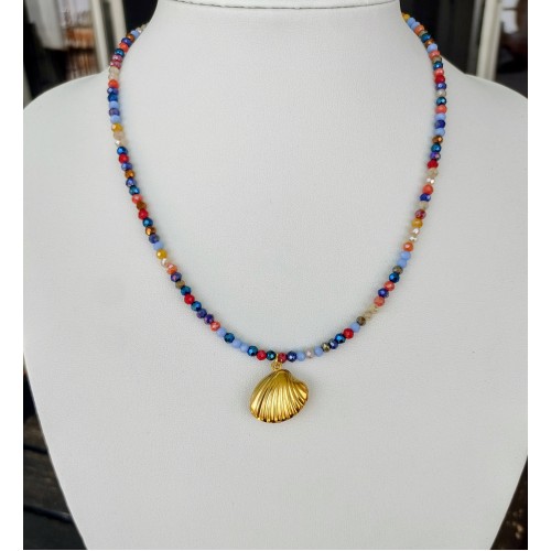 Αιχμαλωτίστε την αύρα του καλοκαιριού με αυτό το πανέμορφο κολιέ! Οι λαμπερές, πολύχρωμες χάντρες του θυμίζουν τα χρώματα του βυθού, ενώ το κομψό χρυσό κοχύλι ως κεντρικό στοιχείο προσδίδει μια αίσθηση διακοπών και ανεμελιάς. Ιδανικό για να προσθέσετε μια νότα φρεσκάδας και κομψότητας στις καθημερινές ή τις καλοκαιρινές σας εμφανίσεις.