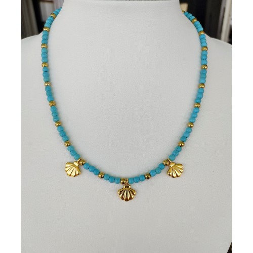 Αναδείξτε το bohemian στυλ σας με αυτό το μοντέρνο και εντυπωσιακό κολιέ. Η έντονη τιρκουάζ απόχρωση των χαντρών συνδυάζεται άψογα με τα χρυσά κρεμαστά θαλασσινά στοιχεία και το διακριτικό ματάκι. Ένα κόσμημα που αποπνέει ανεμελιά και κομψότητα, ιδανικό για layering ή ως το κεντρικό κομμάτι του look σας.
