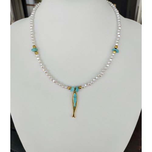 Καλοκαιρινό Κολιέ "Ψαράκι της Τύχης" με Λευκές & Τιρκουάζ Λεπτομέρειες