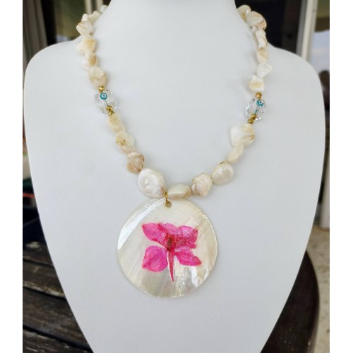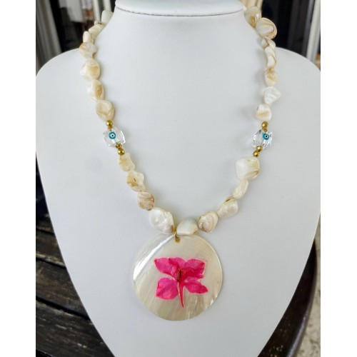 Αιχμαλωτίστε την εξωτική ομορφιά της φύσης με αυτό το μοναδικό χειροποίητο κολιέ. Ο εντυπωσιακός στρογγυλός δίσκος από φυσικό κοχύλι αναδεικνύει ένα αληθινό, αποξηραμένο λουλούδι σε ζωηρή φούξια απόχρωση. Η αλυσίδα αποτελείται από ακανόνιστες χάντρες κοχυλιού, συμπληρωμένες από διακριτικά γυάλινα ματάκια για προστασία και χρυσές λεπτομέρειες. Ένα κόσμημα που αποπνέει καλοκαίρι, φινέτσα και αυθεντικότητα, ιδανικό για να ξεχωρίσετε.