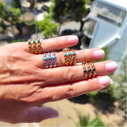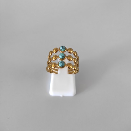 Κομψότητα και ευελιξία σε ένα! Αυτό το ανοιγόμενο, ρυθμιζόμενο δαχτυλίδι "Trilogy" από υψηλής ποιότητας ανοξείδωτο ατσάλι σε χρυσή απόχρωση, αγκαλιάζει κάθε δάχτυλο. Οι τρεις σειρές με τυρκουάζ πέτρες προσδίδουν μοναδική λάμψη και στυλ, ενώ η ανθεκτική του κατασκευή εξασφαλίζει διαχρονική ομορφιά. Ιδανικό για κάθε εμφάνιση!