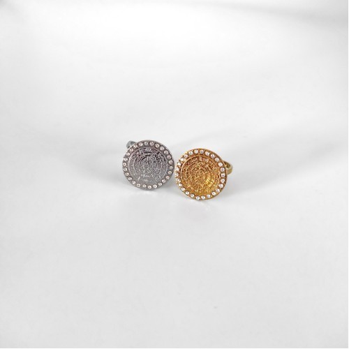 Φορέστε ένα κομμάτι αρχαίας ιστορίας με μια δόση λάμψης! Αυτό το μοναδικό ατσάλινο δαχτυλίδι φέρει ένα περίτεχνο ανάγλυφο σχέδιο εμπνευσμένο από τον θρυλικό Δίσκο της Φαιστού, περιτριγυρισμένο από λαμπερά ζιργκόν που προσθέτουν μια πινελιά πολυτέλειας. Κατασκευασμένο από υψηλής ποιότητας ανοξείδωτο ατσάλι σε λαμπερή ασημί απόχρωση, είναι εξαιρετικά ανθεκτικό στη φθορά. Χάρη στην ανοιγόμενη και ρυθμιζόμενη φόρμα του, προσαρμόζεται τέλεια σε κάθε δάχτυλο, προσφέροντας άνεση και ένα ισχυρό σύμβολο πολιτιστικής κληρονομιάς με αστραφτερό φινίρισμα.