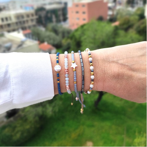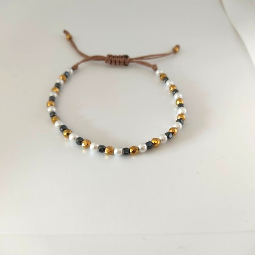 Το βραχιόλι "Πέρλες και Αιματίτης" είναι ένα κομψό και διακριτικό κόσμημα, που συνδυάζει την κλασική ομορφιά της πέρλας με την λάμψη και την πολυτέλεια του αιματίτη. Είναι ιδανικό για όσους αναζητούν ένα κόσμημα που θα προσθέσει μια πινελιά κομψότητας στην εμφάνισή τους. Το βραχιόλι είναι δεμένο διακριτικά με ένα λεπτό, καφέ κορδόνι, το οποίο είναι ρυθμιζόμενο για να ταιριάζει σε διάφορα μεγέθη καρπού.