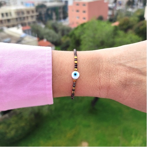 Το βραχιόλι "Καφέ Κρύσταλλα με Μάτι" είναι ένα κομψό και συμβολικό κόσμημα, που συνδυάζει την λάμψη των καφέ κρυστάλλων, τους επίχρυσους αιματήτες και την προστατευτική δύναμη του ματιού. Είναι ιδανικό για όσους αναζητούν ένα κόσμημα που θα προσθέσει μια πινελιά μυστηρίου και προστασίας στην εμφάνισή τους. Το βραχιόλι είναι δεμένο διακριτικά με ένα λεπτό κορδόνι, το οποίο είναι ρυθμιζόμενο για να ταιριάζει σε διάφορα μεγέθη καρπού.