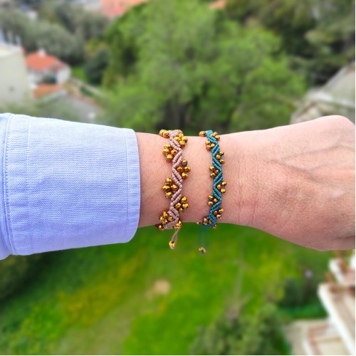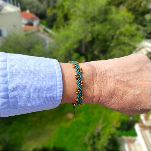 Το βραχιόλι είναι κατασκευασμένο από ένα λεπτό, σμαραγδί κορδόνι, το οποίο είναι πλεγμένο με την τεχνική μακραμέ. Κατά μήκος του βραχιολιού, υπάρχουν χρυσά κρύσταλλα σε σχήμα λουλουδιού, τα οποία είναι τοποθετημένα σε τακτά διαστήματα. Τα κρύσταλλα προσθέτουν μια πινελιά λάμψης και δημιουργούν μια ωραία αντίθεση με το σμαραγδί χρώμα του κορδονιού. Το κλείσιμο του βραχιολιού είναι ρυθμιζόμενο, για να ταιριάζει σε διαφορετικά μεγέθη καρπού.