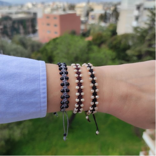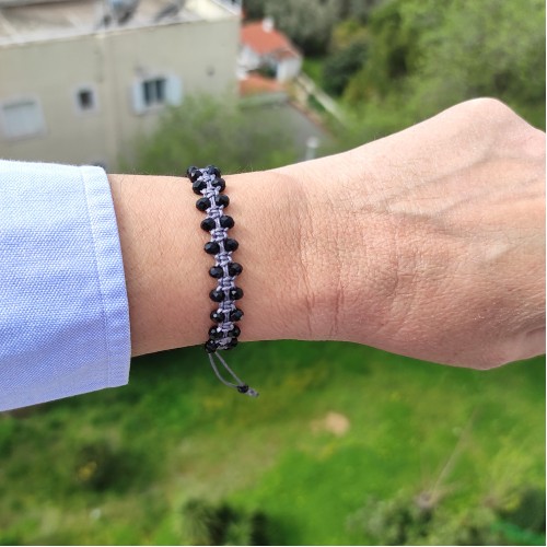 Ανακαλύψτε την κομψότητα του βραχιολιού "Μαύρη Λάμψη". Ένα μοντέρνο κόσμημα που συνδυάζει την αστραφτερή ομορφιά των μαύρων κρυστάλλων με την κομψότητα ενός γκρι πλεκτού κορδονιού. Ιδανικό για να προσθέσει μια πινελιά λάμψης και στυλ στην καθημερινή σας εμφάνιση. Το κλείσιμο του βραχιολιού είναι ρυθμιζόμενο, για να ταιριάζει σε διαφορετικά μεγέθη καρπού.