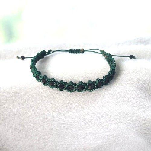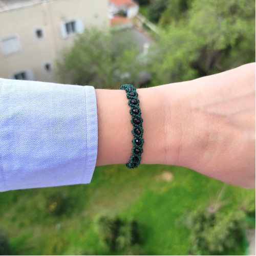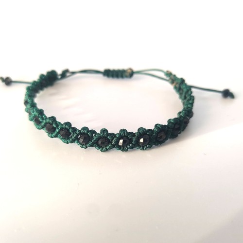 Ανακαλύψτε την κομψότητα και την διακριτική λάμψη του βραχιολιού "Πράσινη Αρμονία". Ένα διακριτικό κόσμημα που συνδυάζει την μυστηριώδη ομορφιά των μαύρων κρυστάλλων με την κομψότητα ενός πράσινου πλεκτού κορδονιού. Ιδανικό για να προσθέσει μια πινελιά λάμψης και στυλ στην καθημερινή σας εμφάνιση. Το κλείσιμο του βραχιολιού είναι ρυθμιζόμενο, για να ταιριάζει σε διαφορετικά μεγέθη καρπού.