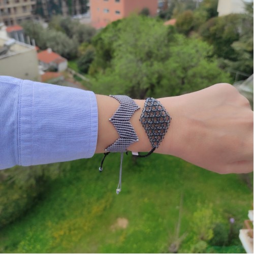 Το βραχιόλι "Macrame Γκρι Zig Zag" προσθέτει μια πινελιά χειροποίητης κομψότητας και λάμψης στην εμφάνισή σας. Ξεχωρίζει για το ιδιαίτερο πλεκτό σχέδιό του που είναι δημιουργημένο με την παραδοσιακή τεχνική macrame. Τα κρυσταλλάκια που είναι τοποθετημένα στις γωνίες του, δίνουν λάμψη και δημιουργούν ένα εντυπωσιακό αποτέλεσμα. Το κλείσιμο του βραχιολιού είναι ρυθμιζόμενο, για να ταιριάζει σε διαφορετικά μεγέθη καρπού.