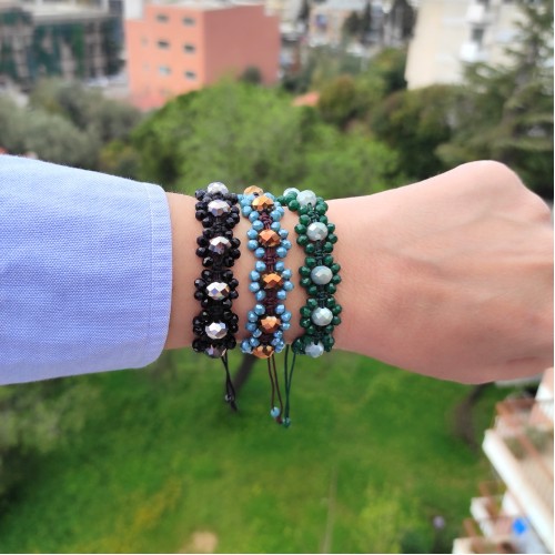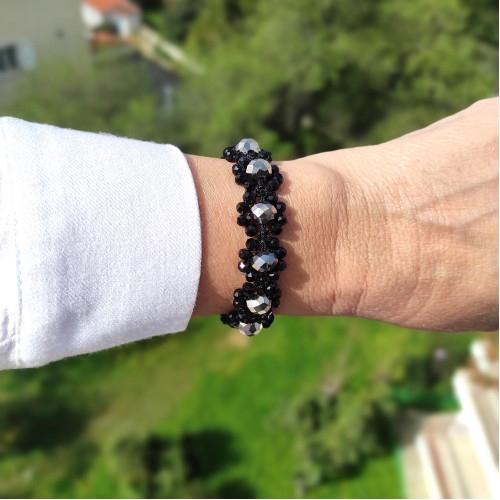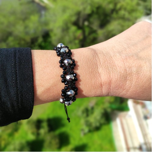 Αναδείξτε την εκλεπτυσμένη σας αισθητική με το βραχιόλι "Μαύρο Ρόδο". Ένα κόσμημα υψηλής αισθητικής που ξεχωρίζει για τον κομψό σχεδιασμό του σε σχήμα ανθισμένου λουλουδιού, κατασκευασμένο με σχολαστική λεπτομέρεια από μικρά, λαμπερά μαύρα κρυσταλλάκια, προσδίδοντας μια νότα διακριτικής πολυτέλειας σε κάθε σας εμφάνιση. Το κλείσιμο του βραχιολιού είναι ρυθμιζόμενο, για να ταιριάζει σε διαφορετικά μεγέθη καρπού.