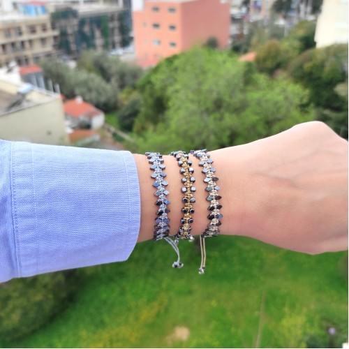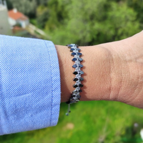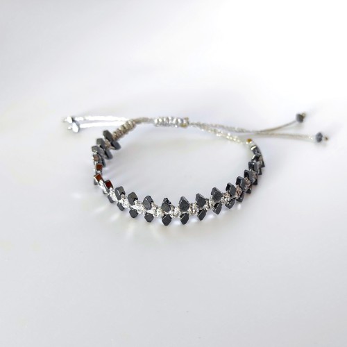 Ένα διακριτικό κόσμημα που συνδυάζει την αστραφτερή ομορφιά των λίθων αιματίτη σε σχήμα φύλλου με την απαλή υφή ενός ασημί κορδονιού.Κομψό, διακριτικό, λαμπερό,ιδανικό για να προσθέσει μια πινελιά λάμψης και στυλ στην καθημερινή σας εμφάνιση. Το κλείσιμο του βραχιολιού είναι ρυθμιζόμενο, για να ταιριάζει σε διαφορετικά μεγέθη καρπού.